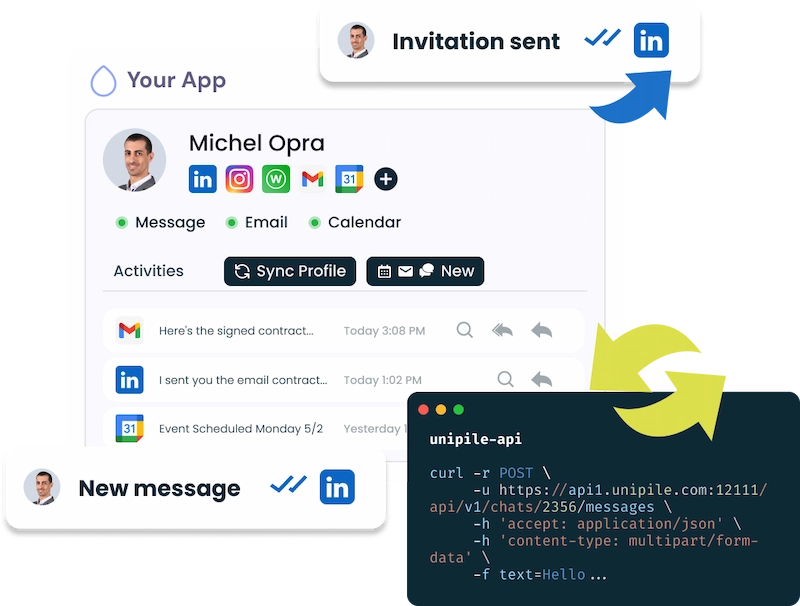 Mit den Messaging-APIs von Unipile können Softwarehersteller LinkedIn-Daten in ihre Kommunikationstools integrieren, was eine optimierte Datenverwaltung und effiziente Outreach-Workflows ermöglicht. Zum Beispiel, durch die Kombination von LinkedIn API Daten mit WhatsApp-API oder Telegramm-APIAPIs können Softwarehersteller effektivere Lösungen für personalisierte Kampagnen über mehrere Kanäle erstellen. Dieser integrierte Ansatz trägt dazu bei, die Effizienz und die Antwortquoten zu verbessern und die Gesamteffektivität der von Softwareanbietern entwickelten Kommunikationstools zu steigern.