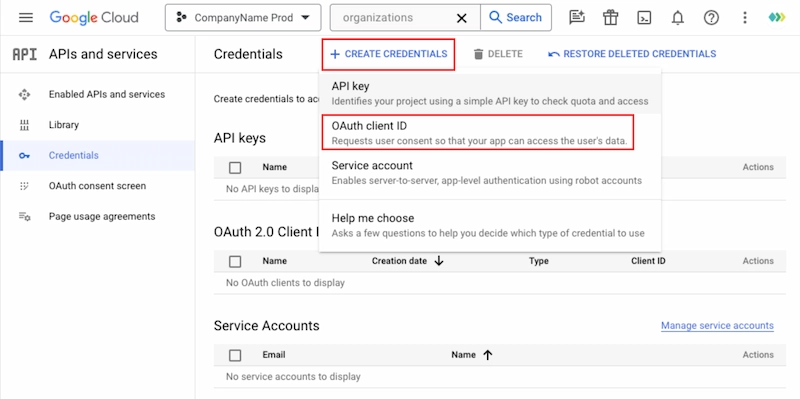 Cree credenciales 'OAuth Client ID' para acceder a sus APIs habilitadas: