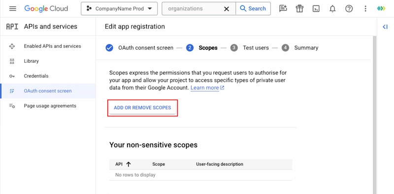 - En la configuración de tu proyecto de Google, ve a Menú de navegación -> API y servicios -> Pantalla de consentimiento de OAuth y confirma lo siguiente: