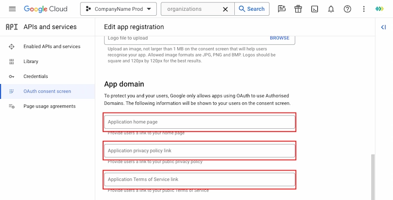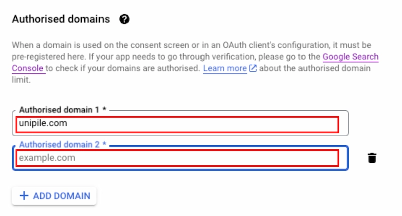 - Añade el dominio de tu aplicación utilizado en tu proyecto de Google. Asegúrate de que tu dominio es el de producción, no el de desarrollo/establecimiento.