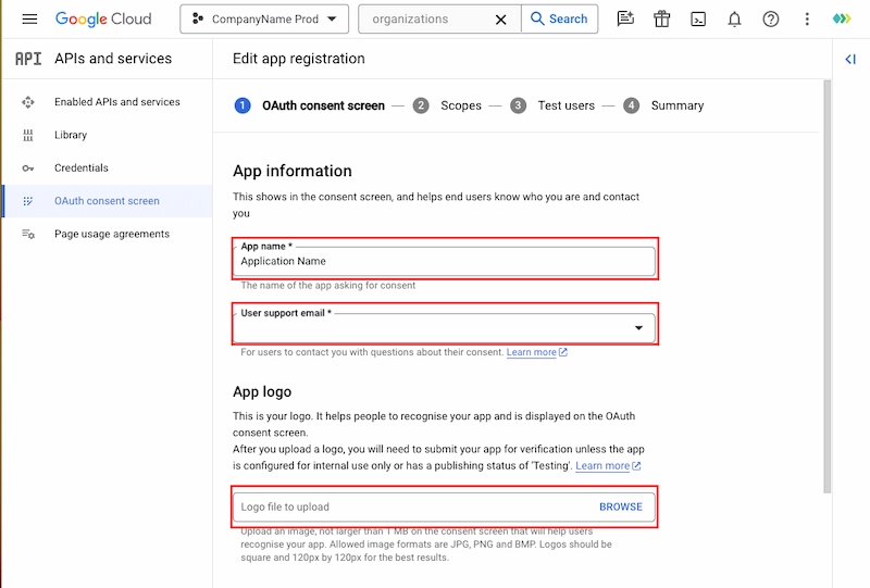 7. Sección de la pantalla de consentimiento OAuth - Información de la aplicación