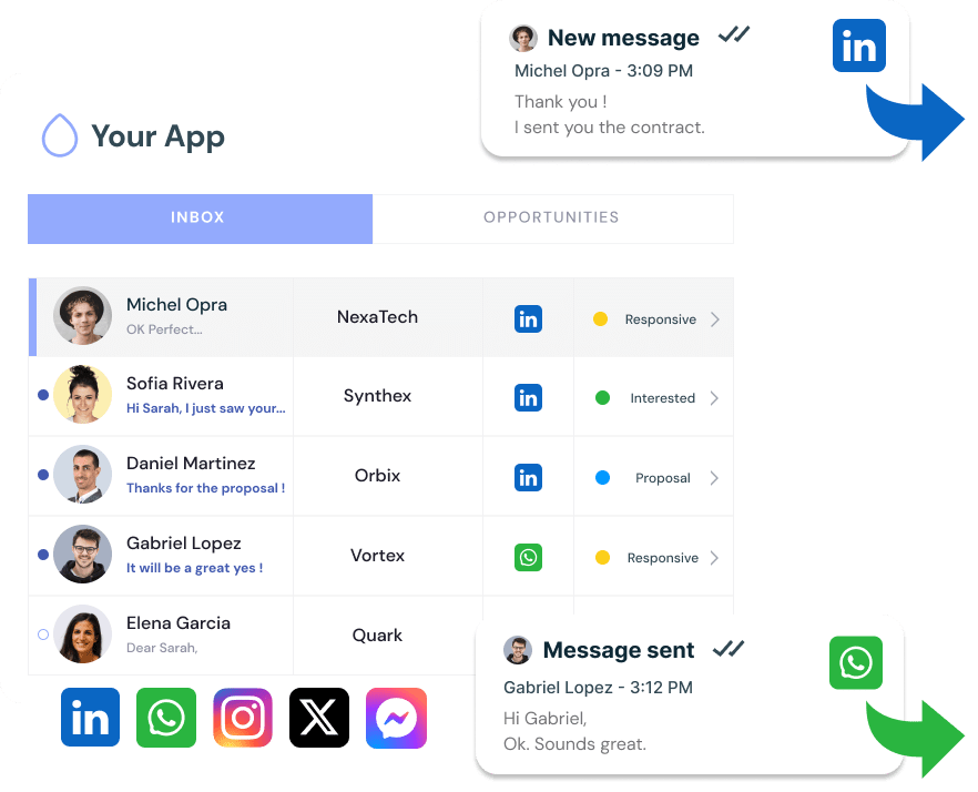 Birden fazla mesajlaşma platformunu yönetmek zor olabilir, ancak Unipile'ın birleşik gelen kutusu, tüm mesajlaşma kanallarınızı (LinkedIn, WhatsApp, Instagram ve daha fazlası) tek bir arayüze getirerek bunu basitleştirir. Bu, işletmelerin konuşmaları kolayca takip etmesine, anında yanıt vermesine ve farklı platformlar arasında tutarlılığı korumasına olanak tanıyarak hiçbir mesajın gözden kaçmamasını sağlar.